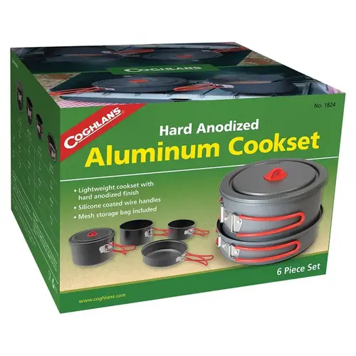 This cook set features hard anodized aluminum construction with silicone-coated stainless steel swing-out handles to ensure they remain cool to the touch. The set includes three pots and a frying pan as well as a unique lid that fits all four pieces, has drain holes incorporated into it and has a stay-cool silicone knob. It all nests together and comes with a mesh bag for convenient storage.
