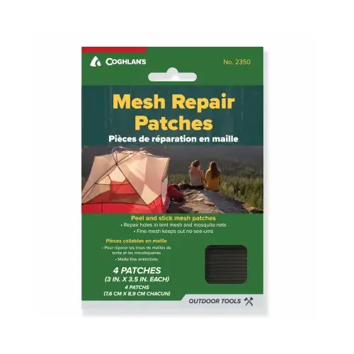 Coghlan's 4 Pack, Mesh Repair Patches. Simply peel off the backing and apply the adhesive mesh patch to cover the damaged area on your tent or mosquito netting. No sewing is required - just peel and stick, and the repair is complete. Ideal for sleeping tents, kitchen tents, no-see-um screens, and personal bug netting. Easy to use: peel and stick. No sewing required. Fine mesh keeps even the smallest bugs out. Dual size: cut in half for smaller repairs.