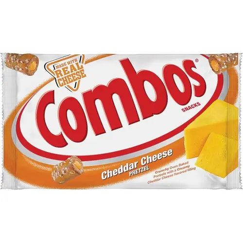 Combos Pretzels, Net Content: 1.8 oz, Flavor: Cheddar Cheese, Nutritional Information: 5 g Total Fat, 3 g Saturated Fat, 300 mg Sodium, 19 g Total Carbohydrate, 1 g Dietary Fiber, 4 g Total Sugars, 2 g Protein, 32 mg Calcium, 1 mg Iron, 100 mg Potassium, 10% Vitamin A, 10% Thiamin, 10% Riboflavin, 10% Niacin , 10% Vitamin B6, 10% Zinc, Ingredients: Wheat Flour, Vegetable Oil (Palm Kernel Oil, Palm Oil and/or Hydrogenated Palm Oil), Whey, Maltodextrin, Food Starch-Modified, Salt, Less than 1.5% Cheese Blend (Bakers and Cheddar, Parmesan, Romano Milk, Cultures, Salt, Enzymes, Annatto Color), Corn Flour, Leavening Baking Soda, Sodium Acid Pyrophosphate), Dextrose, Skim Milk, Hydrolyzed Wheat Gluten, Coloring (Yellow 5 Lake, Yellow 6 Lake, Blue 1 Lake), Lactic Acid, Citric Acid, Lactose, Sodium Caseinate
