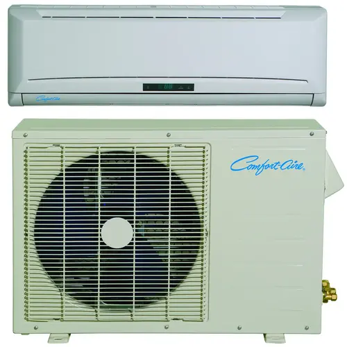 Comfort-Aire by Heat Controller. 9000 or 12,000 Btu Cooling + Heat models 110 V. Ready to install kits. Include 1 each outdoor condenser, Indoor air handler, 25 ft insulated line set, 30 ft communication wire and surge protector. Whisper quiet, high tech fan in the indoor unit delivers balanced air flow. 24 hrs timer and turbo mode. Auto-operation, automatically adjusts to maintain a constant temperature/humidity level. Air filter helps trap dust, pollen and other particles in the air, this permanent filter is designed to be washed on a regular basis and re-installed. Auto restart, reverts to the last setting following a power failure. Low ambient operation, crankcase heater allow operation at 5 deg F (cooling). Includes a fully featured wireless remote.