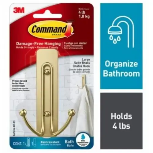 Command bath double hooks with water-resistant strips allow you to keep your bathroom organized both inside and outside of the shower. The hook stands up to hot, wet and humid environments and sticks to a variety of surfaces, including glass, mirror, tile, fiberglass, wood and painted surfaces. Tested and proven to hold better than suction cups, it is easy-to apply and come off cleanly without damage. Repositioning is easy with assorted water-resistant refill strips. Great for bathroom organization including guest and kids' bathrooms, renters and dorm life.