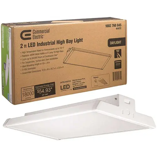 Commercial Electric's 2 ft. High Output Integrated LED Linear High Bay is the perfect replacement for those power-draining 400-Watt Metal Halide or T8 fluorescent tubes. This high bay emits powerful 18,000 Lumens of premium LEDs using 171-Watt of electricity. Provides 5000K Daylight color temperature of light output and is 0-Volt to 10-Volt dimmable to save energy. Constructed of a robust durable design, it is shatter-resistant, with no hot spots and will not discolor over time. There are 3 mount options: suspension, surface and stem installation. It is maintenance free with no bulbs to replace for up to 60,000-hours of continued use. Ideal applications are large garage, shipping/receiving, warehouse and aisles, large commercial retail stores or sports facility.