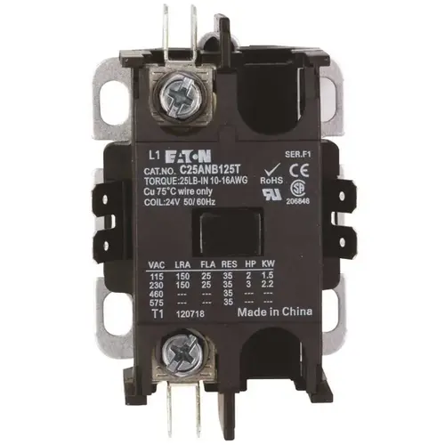 Eatons 40A, single pole, Type C25 contactors feature a compact, efficient design with a low VA coil and straight-through wiring. New contactor housing design effectively limits dust and other contaminants from magnet structure reduces or eliminates noise. These economically priced, UL recognized ampere rated devices are well suited for use in heating/air conditioning, refrigeration, data processing and food service applications.