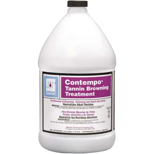 Contempo Tannin Browning Treatment is a mild acidic product that safely removes browning, yellowing and water spots from over-wetting. It is also an effective neutralizer for carpet yellowing from alkali residue. Designed for quick stain lifting action, Contempo Tannin Browning Treatment addresses the most common spotting obstacles encountered when cleaning carpet.
