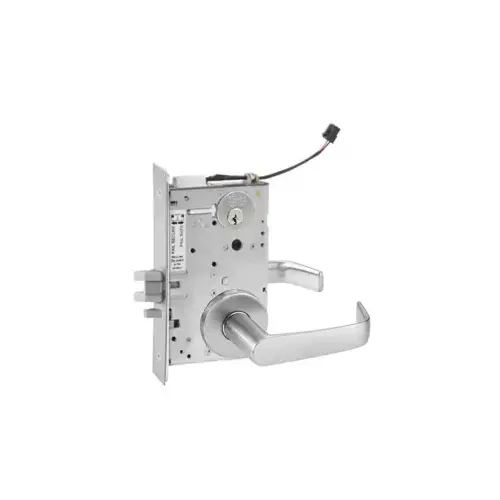 KIT - Electrified Mortise, Field Reversible - Fail Safe and Fail Secure, with REX Request to Exit Switch, Newport Lever with A Rose Trim, Less Cylinder, Handing is Field Reversible, ANSI Strike SS118, Satin Chrome 626/26D