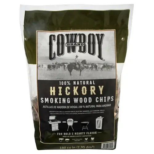 Cowboy 100% all-natural hickory wood chips add a smoky flavor to your grilled foods. The hearty aroma and full flavor of hickory wood gives meat an unmistakable woodsy taste. This flavor goes well with any meat, but pairs particularly well with beef, pork and chicken. Like all Cowboy wood chips, these hickory wood chips burn more quickly than chunks, making them ideal for shorter cook times.