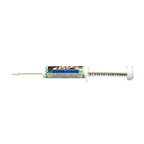 Cox Veterinary Lab Super Clear formerly known as Clear Passage Cox Veterinary Lab Super Clear can be used to help clean, soothe and open a horse's air passages. It is great to use prior to competition as it helps clean the mouth area of dust, pollen, and other airborne debris. Features: Wind and cough remedy Helps clean, soothe and open a horse's air passages Honey flavored Liquid or paste form Item Specifications: Liquid Guaranteed Analysis per oz.: Riboflavin (Source of Vitamin B12): 10mg Liquid Ingredients: Honey, Glycerin, Vinegar, Aloe Vera, Peppermint Oil, N-Propyl Alcohol, Menthol, Lemon Juice, Oil of Eucalyptus, Riboflavin (Source of Vitamin B2), Sodium Benzoate. Paste Ingredients: Honey, Glycerin, Vinegar, Aloe Vera Peppermint Oil, Ethyl Alcohol, Menthol, Lemon Juice, Oil of Eucalyptus, Riboflavin, Sodium Benzoate. Directions for Use: Administer 1/2 oz. (liquid) or 10ml (paste) 30 minutes prior to daily exercise or competition. For additional product information, please see clickable links listed under Downloadable Resources.