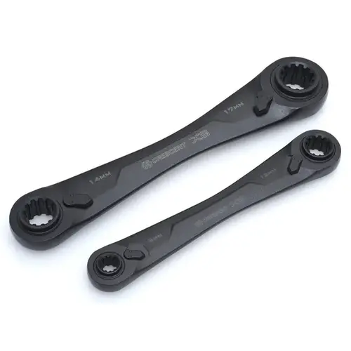 Innovative stepped box ends deliver access and clearance, 5 deg ratcheting arc provides great access to fasteners. fits 6 fastener types hex, square, 12 pt, "E-Torx", rounded hex and spline. Smooth profile allows for more torque to be comfortably applied to the fastener. Each wrench is capable of 4 sizes 8 mm, 10 mm, 12 mm, 13 mm and 14 mm, 15 mm, 17 mm and 19 mm for a total of 8 sizes in just 2 wrenches.