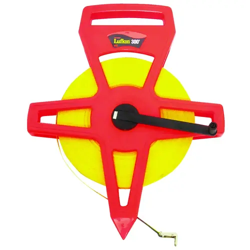 Open four arm frame design protects blade, does not trap dirt in case. Lightweight, strong, easy to handle and rewind orange case is easy to find and two material grip is comfortable to use. Yellow clad fiberglass blade impervious to moisture. Folding end hook for true-zero measurements. Feet and inches graduated to 8ths, numbered feet and instantaneous feet.