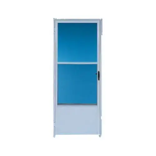 32" x 80", White Self Storing Storm Door With Screen, 1" Aluminum Frame Has Reversible Hinge For Right Or Left Hand Installation, Hinge Side Has Three Semi-Concealed Hinges, Heavy Duty Closer & Handle Kit Are Included, Self Storing Lower Tempered Glass Panel Provides Adjustable Ventilation.