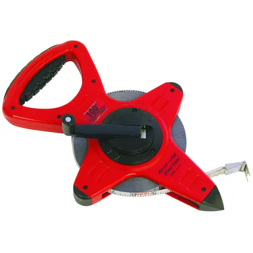 Impact-resistant, open reel, with large soft rubber grip handle. Nylon coating withstands extreme temperatures, water and chemicals. Crank handle folds flat to prevent breakage. Flexible, high tempered steel tape core. Wear-resistant graduations in feet, inches and 8 ths. Numbering starts at hook.