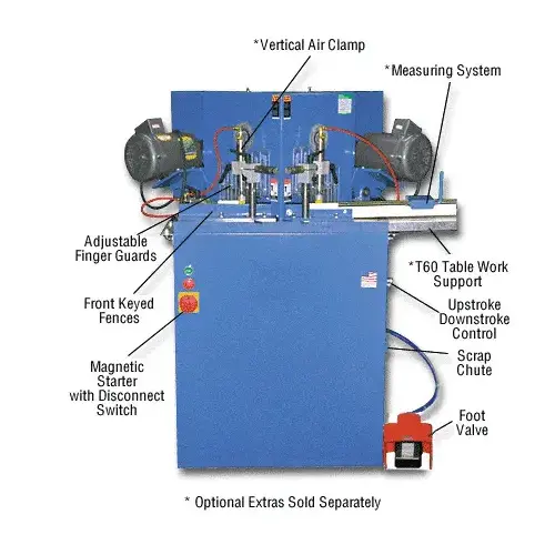 The 34-1/2" (876 mm) tall table features a fully enclosed heavy gauge steel base with a 6" (152 mm) dust outlet and built-in scrap chute. The D45AX will accept 10" (254 mm), 12" (305 mm), or 14" (356 mm) Saw Blades. The individual saw heads are adjustable to compensate for blade variations resulting in minimized scrap. Another feature unique to the D45AX is the ability for adjustment of the blade position above the material to be cut and the precise length of the down stroke to cut that material. This allows minimal stroke time and maximum production. The D45AX is capable of cycling at one second intervals though actual cycle times, depending on material being cut.
