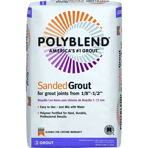 A polymer-modified, cement-based sanded grout that produces hard, dense joints that resist shrinking, cracking and wear. Formulated for durability, Polyblend sanded grout accommodates 1/8 in to 1/2 in joints for interior or exterior installations including floors, countertops, walls, ceilings, showers, fountains and pools.