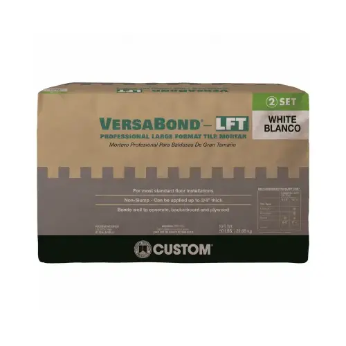 VersaBond-LFT fortified medium bed mortar is a general-purpose, economical, polymer modified medium bed mortar for use with large format porcelain, ceramic and natural stone tile. With a non-slumping formula to eliminate lippage, VersaBond-LFT can be applied to 3/4 in (19 mm) thick on horizontal applications.