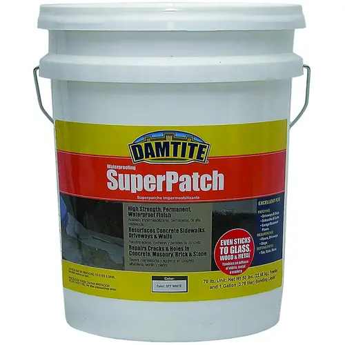 SuperPatch is a two-component, multi-purpose, waterproofing mortar for patching, repairing or resurfacing concrete, masonry, stucco and brick, up to 1 in thickness in one application. Exact amount of powder and liquid are included in this container. Just mix the powder with liquid together in a clean container. SuperPatch is a non-shrink, unique formula with exceptional strength and adhesion for use on worn surfaces. It evens sticks to glass, steel, aluminum and wood, so is ideal for areas abutting these materials. Can be feather edged or applied up to 3 in thickness, using multiple layers. Ideal to anchor bolts, railings and other fixtures into concrete or to build-up worn or broken step corners without using forms. Use for vertical or horizontal, above or below grade patch and repair projects both inside and out. Will not cause acidic reaction with aluminum.