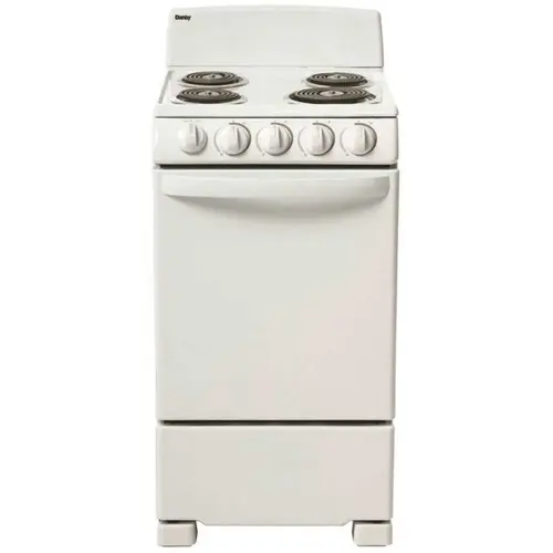 Danby20³ free standing electric range with a large 2.3 cu. ft. oven capacity This Ultra-Compact Electric Range By Danby May Only Be 20-Inches Wide, But It Comes With Everything You Need For Fine Dining. Perfect Cook Technology: A redesigned interior with a circular base that distributes the heat better, cooking your food more evenly. Powerful Even Baking: four pass bake (2,000W) and broil (2,400W) elements for maximum baking power. It boasts an easy-to-clean porcelain cooking top. Flexibility: two oven racks with four adjustable positions and safety stops for optimal cooking Angular Control Panel & Front Knobs: front mount easy to reach, push and turn safety knobs. ADA Compliant Range: meets requirements set out by Standards for Accessible Design for people with disabilities. Range includes an oven and four burners: one eight-inch coil element and the other three being six-inches Temperature limiting coils: The coil element will turn off when the pan reaches the max temperature in accordance with UL 858 60A. 1x 8" (2,400W) for quick boiling and 3 x 6" coil elements (1,250W) This range offers a 24-month warranty on parts and labor. Mfg #DER203W