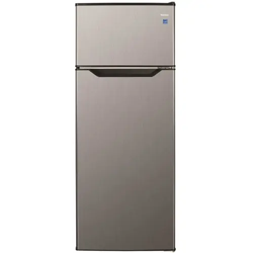 Danby 7.4 cu. ft. Apartment Size Top Mount Fridge in Stainless Steel 7.4 Cu Ft. (210 L) Capacity Apartment Size Top Mount Refrigerator ENERGY STAR® certified: Energy-efficient to help you save money without sacrificing performance Environmentally friendly R600a refrigerant 2 full width and 1 half-width adjustable glass shelves for maximum storage versatility Integrated door shelving with 3 full door shelves The reversible door can be modified for a left or right-hand opening 24-month warranty on parts and labor with in-home service Mfg #DPF074B2BSLDB-6