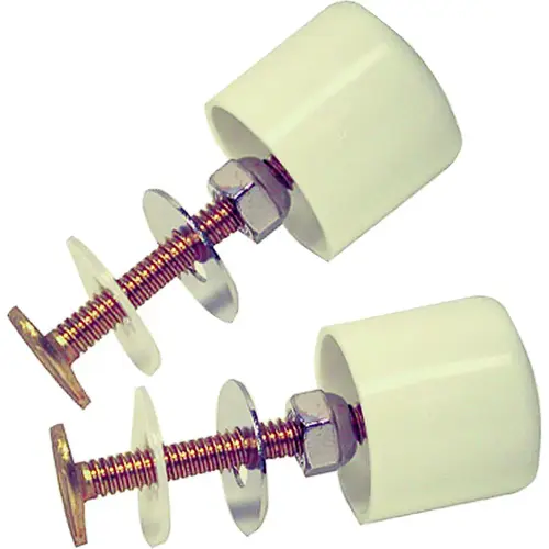 White screw-on toilet caps. Brass bolts with break-off feature.
