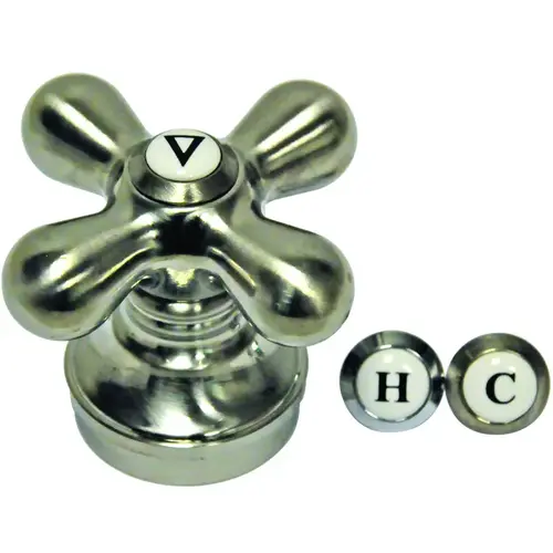 Introduce a touch of style to your faucet fixture with the Danco cross-arm handle. This custom look handle features a cross-style design in a brushed nickel finish. The universal design includes adapters to fit most faucets with a 1 in Dia at the base. It features a metal construction that provides strength and durability with an overall height of 2-3/4 in. The handle includes hot, cold and arrow buttons that allow for you to chose which index button you would like to you. The complete kit includes everything you need to install this replacement handle.