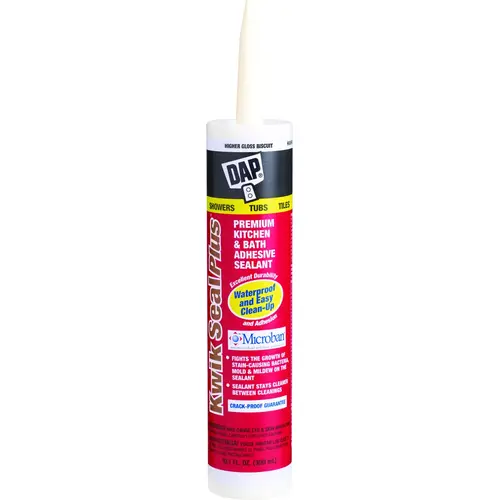 DAP KWIK SEAL PLUS kitchen and bath siliconized adhesive sealant contains Microban antimicrobial product protection to fight the growth of stain and odor-causing bacteria, mold and mildew on the sealant. The advanced Microban protection neutralizes bacterial and fungal growth where it lives and breads. This means the sealant is easier to keep clean and stays cleaner longer. This specially formulated siliconized adhesive sealant provides excellent adhesion and flexibility for a 100% waterproof and crackproof seal around tubs, sinks, showers, countertops and fixtures. KWIK SEAL PLUS is easy to apply and tool, paintable, low in odor and cleans up easily with water.