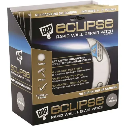 DAP Eclipse rapid wall repair patch is a new, revolutionary product solution for repairing drywall damage. No more waiting for spackling to dry or messy sanding. DAP Eclipse allows you to patch drywall damage and paint immediately, allowing you to finish your project faster. This all-in-1, mess free solution not only provides a permanent, long-lasting repair but also superior impact resistance for areas that may see reoccurring impact, such as behind a door.