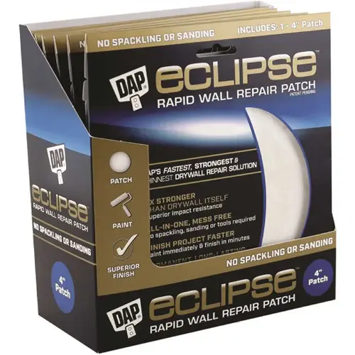 DAP eclipse rapid wall repair patch is a new, revolutionary product solution for repairing drywall damage. No more waiting for spackling to dry or messy sanding. DAP eclipse allows you to patch drywall damage and paint immediately, allowing you to finish your project faster. This all-in-one, mess free solution not only provides a permanent, long-lasting repair but also superior impact resistance for areas that may see reoccurring impact, such as behind a door.