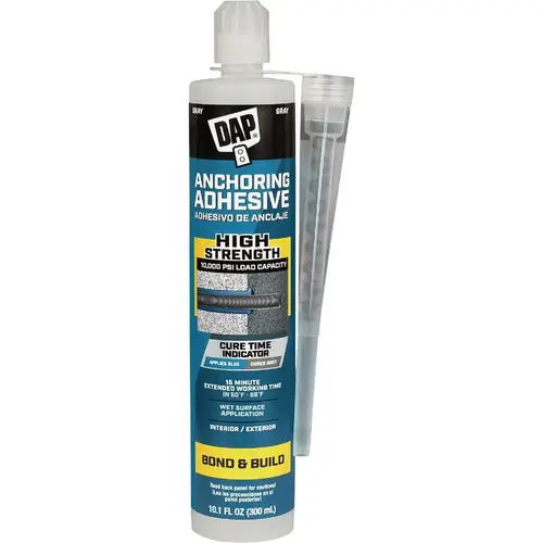 Dap Anchoring Adhesive is a low odor, styrene free, 2-component adhesive with a cure time indicator. It applies blue and cures gray once fully cured. There is an extended working time of 15 minutes in room temperatures (50F to 68F). Ideal for common residential anchoring projects such as setting bolts and threaded rods to install railings, racks and more. It can be used with a standard caulk gun for easy use for vertical and horizontal applications. Interior/Exterior use.