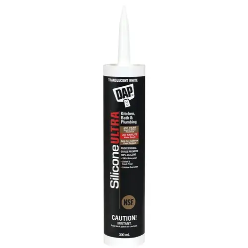 DAP Silicone Ultra is a premium performance 100% silicone sealant that provides 20 years mold and mildew resistance. It won't crack or shrink, providing a durable, permanent 100% waterproof seal. DAP Silicone Ultra is water-resistant in 30 just min. Once cured, it is safe for incidental food contact (NSF certified). Ideal for a wide variety of kitchen and bath applications such as sealing around sinks, tubs, showers, back splashes, countertops and fixtures.