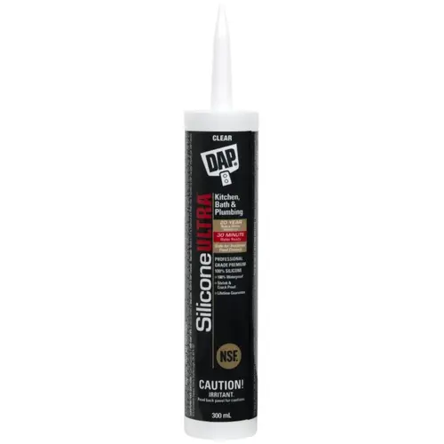 DAP Silicone Ultra is a premium performance 100% silicone sealant that provides 20 year mold and mildew-resistance. It won't crack or shrink, providing a durable, permanent 100% waterproof seal. DAP Silicone Ultra is water-resistant in 30 just minutes. Once cured, it is safe for incidental food contact. Ideal for a wide variety of kitchen and bath applications such as sealing around sinks, tubs, showers, back splashes, countertops and fixtures. Backed by a lifetime guarantee.