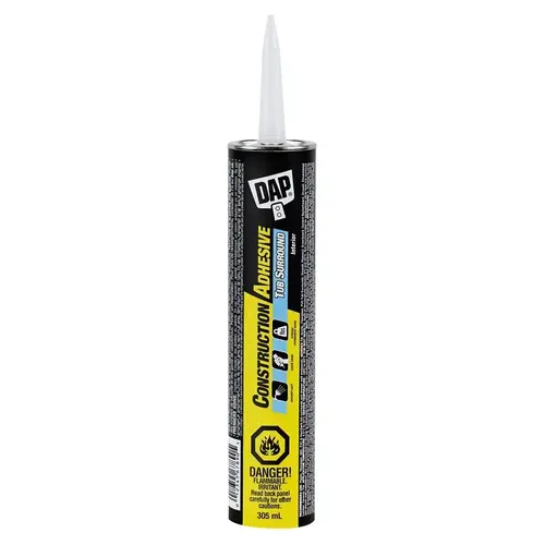 DAP construction tub surround construction adhesive is a premium grade, high-strength adhesive specifically formulated for tub surround installation. This premium adhesive is safe for use on all tub surround materials and dries clear for an ideal finish. Tub surround is an instant grab adhesive that is moisture, steam, water and heat resistant once fully cured.
