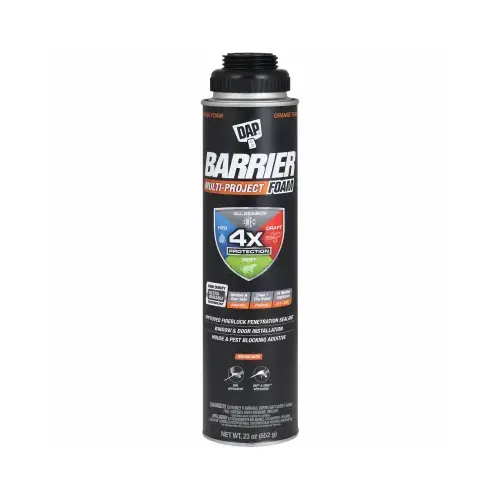 DAP Barrier multi-project gun-grade foam is proven to offer complete 4X protection for homes while offering more projects per can and less waste. Barrier ultra-durable, high-density, all seasons formula blocks drafts, water, fire and pests. And Barrier is specially formulated for all sealing projects including small and large gaps, windows and doors (meets AAMA-812), pest entry points and fire blocking penetrations. Barrier is orange in color for easy building inspections and is available in a 23 oz aerosol can for use with any gun foam applicator.