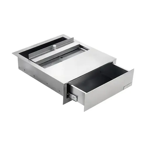 The Deal Drawer is designed for controlled transaction handling at teller windows, cashier stations, and service counters in commercial and institutional environments. This recessed transaction drawer allows cash, documents, ID cards, and small items to be passed between staff and customers while maintaining separation at the counter opening. The unit is manufactured from stainless steel and finished in brushed stainless steel to match common counter and window hardware. The drawer is designed to be recessed into the front edge of the countertop, creating a flush appearance after installation and supporting clean counter layouts. Overall outside dimensions measure 15-3/4" width x 16-1/4" depth x 4-15/16" height. Inside usable space measures 12-3/8" width x 13-1/4" depth x 2-7/8" height, providing room for cash trays, envelopes, paperwork, and small items used during daily transactions. Ball bearing glides allow smooth sliding movement, and a full-width rear handle supports controlled operation from the staff side. A lid is included and is designed not to open while the drawer is extended, supporting controlled access during use. Glazing above the flat hood section acts as a barrier while allowing normal drawer operation. Counter fabrication is required prior to installation, and instructions are included.