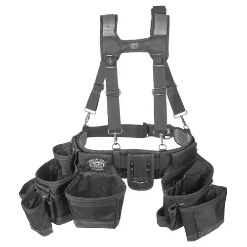 Made of 1680 denier heavy-weight poly fabric. "LoadBear" stretch suspension, infinity belt fits up to 52 in. Single body construction (no joints to fail). Barrel bottom pouches for extra capacity.