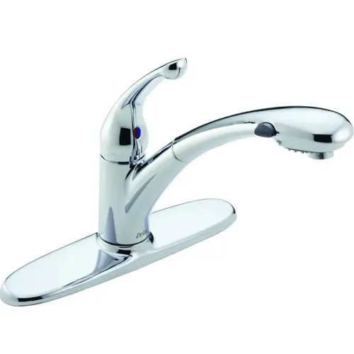 Pull-out spray wand provides 38 in reach, high-arc spout provides 9 in of reach and 8 in of height, swings 120 deg for added convenience, center mount or 8 in centers, includes 10-3/4 in Escutcheon/base.