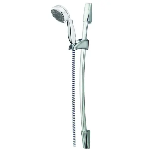 7-spray-massage hand shower (wide full spray, standard full spray, drenching full spray, massage spray, full spray with massage, energy saving spray, trickle), anti-clog nozzles for removal of mineral deposits, easy-turn lever to change sprays, 72 in flexible vinyl hose, 29 in contemporary wall bar, adjustable height hand shower mount, operates at 2.5 gpm. Blister packaging.