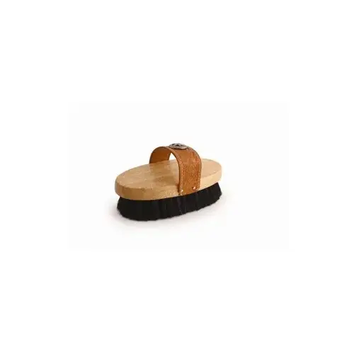 Small western-style strap-back, kiln-dried hardwood oval brush block filled with a medium soft blend of black poly and horsehair. Embossed, saddle-stitched, oiled leather strap attached with nickel-plated fasteners, and featuring our signature nickel-plated Texas-star concho. Lush blend of black horsehair & fine polypropylene fiber and strap-back western styling are excellent for body and finish grooming. Traditional-sized brush block is well-suited to the average hand, with a sturdy strap to support lateral grooming motion.