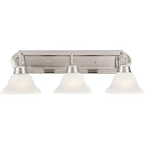 The Design House 517383 3-Light Millbridge Vanity Light is made of formed steel, soft alabaster glass and finished in satin nickel. This 3-light wall mount is rated for 120-Volts and uses (3) 60-Watt medium base incandescent bulbs. This wall mount™s petite design mounts seamlessly to the wall without a chain or visible wires. Measuring 8.5 in. (H) by 26.5 in. (W), this 5.6 lbs. fixture can be mounted facing up or down depending on location and preference. Clean lines and sleek details accentuate the alabaster glass to create an elegant centerpiece in a bathroom. This product is UL and cUL listed and approved for damp areas. The Millbridge collection features a beautiful matching chandelier, wall sconce, ceiling mount and mini pendant. The Design House 517383 3-Light Millbridge Vanity Light comes with a 10-year limited warranty that protects against defects in materials and workmanship.