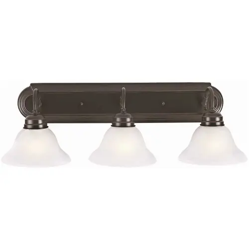 The Design House 517615 Millbridge 3-Light Vanity Light is made of formed steel, soft alabaster glass and finished in oil rubbed bronze. This 3-light wall mount is rated for 120-Volts and uses three 60-Watt medium base incandescent bulbs. This wall mount's petite design mounts seamlessly to the wall without a chain or visible wires. Measuring 8-1/2 in. by 26-1/2 in., this 5.6 lbs. fixture can be mounted facing up or down depending on location and preference. Clean lines and sleek details accentuate the alabaster glass to create an elegant centerpiece in a bathroom. This product is UL and cUL listed and approved for damp areas. The Millbridge collection features a beautiful matching chandelier, wall sconce, ceiling mount and mini pendant. The Design House 517615 Millbridge 3-Light Vanity Light comes with a 10-year limited warranty that protects against defects in materials and workmanship.