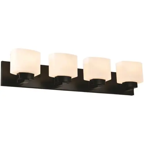 This Design House wall light has a rectangular backplate and square shaped glass shades. Constructed of formed steel with a matte black finish and frosted glass, this 4-light wall mount adds a modern accent to your home. Measuring 6.5 in. H x 32 in. W, this 7.7 lbs. vanity light features a detailed steel trim to add elegance in any room or entry way. This fixture uses four 60-Watt medium base incandescent bulb.