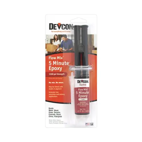 A two-part, rapid curing, clear, general-purpose epoxy. Better on more rigid materials. Useful for repair of autos, bikes, boats and more. May also be used as a metal filler and to restore rotten wood. Apply mixed epoxy directly to your repair. The Flow-Mix nozzles automatically mixes resin and hardener together.