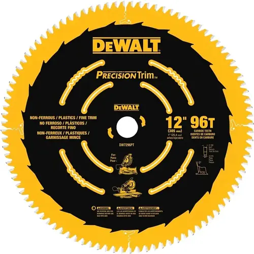 Featuring premium micrograin and extra-sharp carbide cutting edges, DeWALT large diameter Precision saw blades power through non-ferrous metal and plastic with ease. Exclusive dampening slots helps to reduce vibration and a precision-balanced, laser-cut body provides exceptionally accurate cuts. A tough coat finish helps to reduce heat, friction and gum up to promote blade life.
