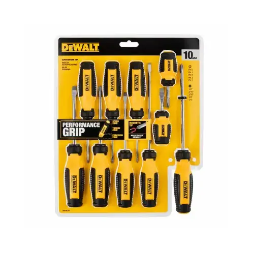 The 10-piece screwdriver set is a must have with its color-coded handles for easy tip selection. The magnetic tip conveniently holds screws in place during use. The bi-material quad-lobe handle allows for maximum torque and comfort.