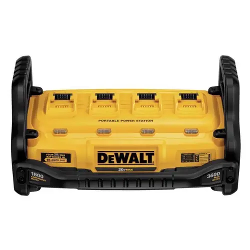 Portable power station from Dewalt allows for AC power in remote locations for convenient portable power. Able to run most corded tools, it provides 1800 watts (15 amps) of continuous power and 3600 watts peak power. Runs on four 20 volt Max Dewalt batteries (including FLEXVOLT), and for high power applications, four 20V MAX 3.0Ah DEWALT Batteries (DCB200) or higher amp hour are recommended to provide the best results. Not only can the 1800 watt portable Power Station power a corded tool remotely, but it also becomes a multi-port parallel charger for up to four Dewalt batteries when plugged into a wall outlet via extension cord (sold separately). Compact and lightweight, the 1800 watt portable station weighs just 18 lbs (without batteries) and is easily portable. Without the need for gas to run, there are no fumes or carbon monoxide emitted from the device. In addition, the portable power station can be used to provide temporary power in areas where noise is restricted such as a jobsite with strict regulations or even camping and tailgating. With an integrated temperature controlled cooling fan and heavy-duty roll cage, the Portable Power Station is a durable and convenient power solution for a variety of uses. Features one 120 volt receptacle and has a two hour charge time.