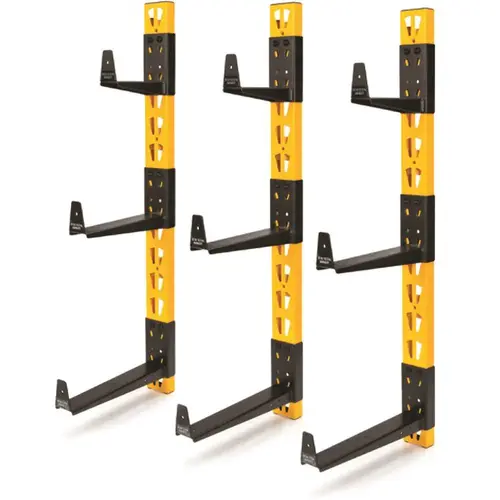 Dewalt 3-Piece Wall Mount Cantilever Rack. Serious Capacity - Each Short Arm Can Support 50-Pounds, 25-Pounds Per Medium Arm, And 16-Pounds Per Long Arm For A Total Of 273-Pounds Of Evenly Distributed Storage. Multiple Depth Storage - Set Includes 3 Different Cantilever Arm Lengths With 6-Inch, 10-Inch, And 12-Inch Lengths. Powder-Coated Steel - Arms And Rails Are Made Of Durable Steel With An Industrial Grade Powder Coating That Won't Chip Or Fade. Arm End Stops - Each Support Arm Features A 2.5-Inch Flat Tab On The End To Prevent Round Stock From Rolling Off. Easy Mounting Rails - 36-Inch Tall Wall Mount Rails Easily Mount To Both Finished Walls Or To Bare 2x4 Studs. Adjustable Height - Cantilever Arms Can Be Adjusted In 2.35-Inch Increments. Mfg #41589