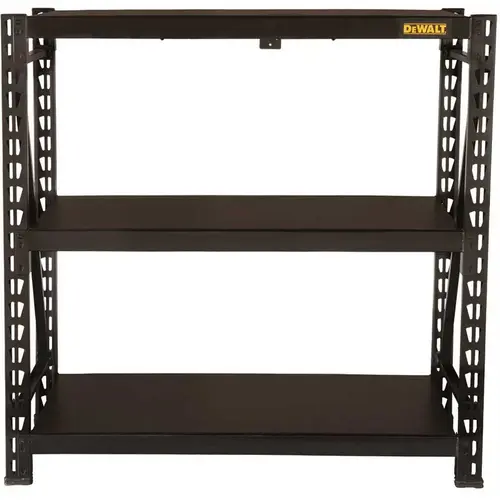 Dewalt 4 Foot Tall Black Frame,3 Shelf Industrial Storage Rack. Available May 2021. Large Capacity - 3 Black Laminate Wood Composite Decks Can Each Support 1,500 Lb. For A Total 4,500 Lb. Capacity. Powder-Coated Steel - Industrial Powder-Coated Finish On The Steel Uprights, Support Straps, And Crossbeams Won't Fade Or Chip. Nylon Foot Pads - Rugged Glass-Filled Nylon Feet Protect Powder Coat From Damage And Also Prevent Damage To Flooring. Multiple Support Straps - Each Shelf Features A Total Of 5 Support Straps To Prevent Twisting Or Spreading Under Heavy Loads. Safety Features - Locking Pins Secure Crossbeams And Wall Mounting Anchor Bracket Prevents Accidental Tipping. Large Storage Surface - Shelf Decks Measure 44.25-Inches X 17.5-Inches To Provide Ample Space To Store Tools And Parts. 2.35-Inch Increments - Shelves Are Adjustable In 2.35-Inch Increments For Custom Storage Sizing. Expandable - Join Multiple Racks Together Vertically Or Horizontally To Create A Complete Storage Or Workspace Solution. Stress-Free Assembly - Two Uprights Come With Pre-Installed Horizontal And Diagonal Support Beams For Easy, Stress-Free Assembly. Mfg #41658