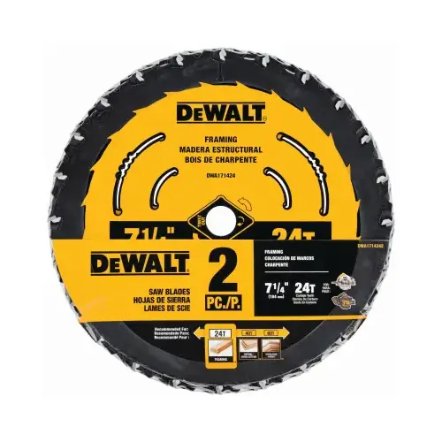 DEWALT saw blades are ideal for any wood-cutting application. The exclusive, patent-pending ToughTrack tooth design, on our framing and ripping blades is engineered to deliver straight, accurate cuts over the life of the blade. Patented body slots reduce vibration, which works with the blade's thin kerf design to deliver exceptional user feel. High-density tungsten carbide teeth are tough, wear-resistant and provide long life. The reinforced shoulder is designed for strength and durability by providing impact resistance, especially in nail-embedded wood. These blades come with ToughCoat anti-stick coating to reduce friction and gumming. Optimized for use on both corded and cordless circular saws.