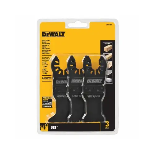 DEWALT 1-1/4 In Carbide Oscillating Tool Blade For General Purpose Cutting (3 Pack). DEWALT Oscillating Blades are optimized to cut through wood, drywall, wood with nails, and metal. Bi-Metal technology provides wear resistance when cutting hard materials. Universal Fitment design allows for quick, tool-free blade change.