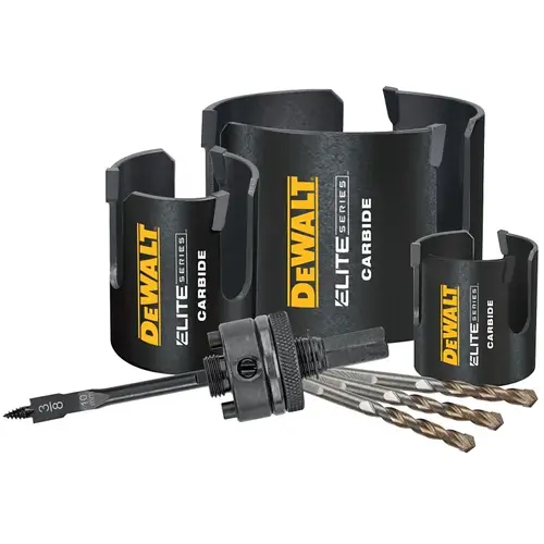 DeWALT ELITE Hole Saw Kit, Specifications: Carbide Tipped Tooth, 3 Teeth, 2-7/16 in Max Cutting Depth, 1/4 in Bit Dia, Number of Pieces: 7, Includes: 2-1/8, 2-9/16, 3-5/8 in Hole Saws, Arbor and (3) Replacement Carbide Pilot Drills