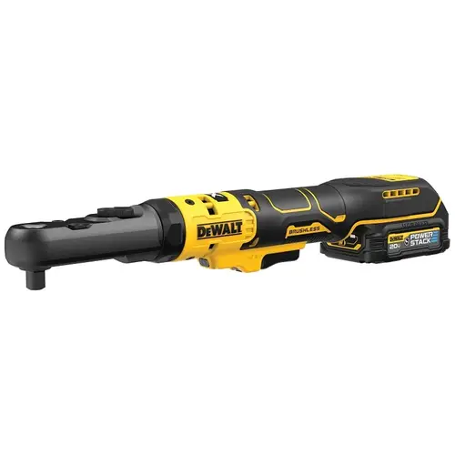 Engineered with the professional in mind, the 20V MAX* XR 3/8 in and 1/2 in sealed head ratchet has the power, versatility and durability, needed on the job. This cordless ratchet has a brushless motor that delivers 75 ft-lb of max torque and a no-load speed of 0 to 300 rpm to fasten and remove stubborn nuts and bolts. Maximize versatility with the ability to quickly swap between interchangeable 3/8 in and 1/2 in square drive anvils for a variety of applications, as well as quickly change from forward/reverse for efficient working. The sealed head design and glass filled nylon tool housing is designed to help prevent damage from automotive oils and solvents found on the job. Brighten your workspace with the integrated LED light and prevent accidental tool activation using the tool's trigger lock. This kit includes one 20V MAX* DEWALT POWERSTACK oil-resistant compact batteries that are 50% more powerful, 25% more compact and 15% lighter.