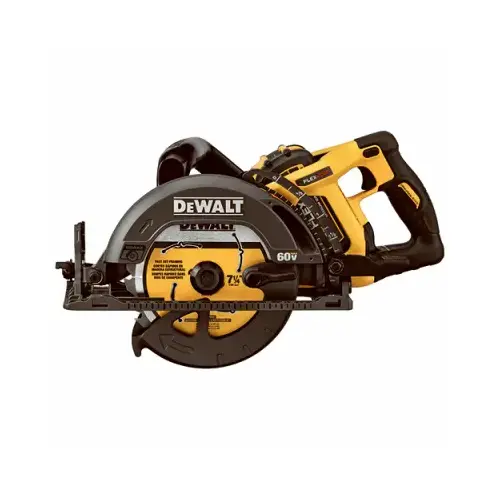 The FLEXVOLT 60 V maximum 7-1/4 in cordless worm drive style saw with FLEXVOLT 20 V/60 V maximum 9.0 Ah battery offers big run time. The blade is oriented to the left of the motor and the handle is at the rear to optimize line of sight when cutting. An electronic brake helps stop the blade after the trigger is released. Bevel capacity is 53 deg with stops at 45 deg and 22.5 deg. The saw makes smooth, accurate cuts and delivers long run time with a durable, high-grade magnesium shoe and an efficient brushless motor. This cordless worm drive style saw cuts to a depth of 2-7/16 in at 90 deg. The included rafter hook makes it convenient to hang the tool on the jobsite. This tool is also Tool Connect Tag-Ready so you can easily track it by attaching a Tool Connect Tag. It's ideal for wood cutting applications such as oriented strand board, plywood, hardwoods, dimensional lumber and flooring. Professional framers, concrete formers, carpenters and general contractors can boost their productivity with this tool.